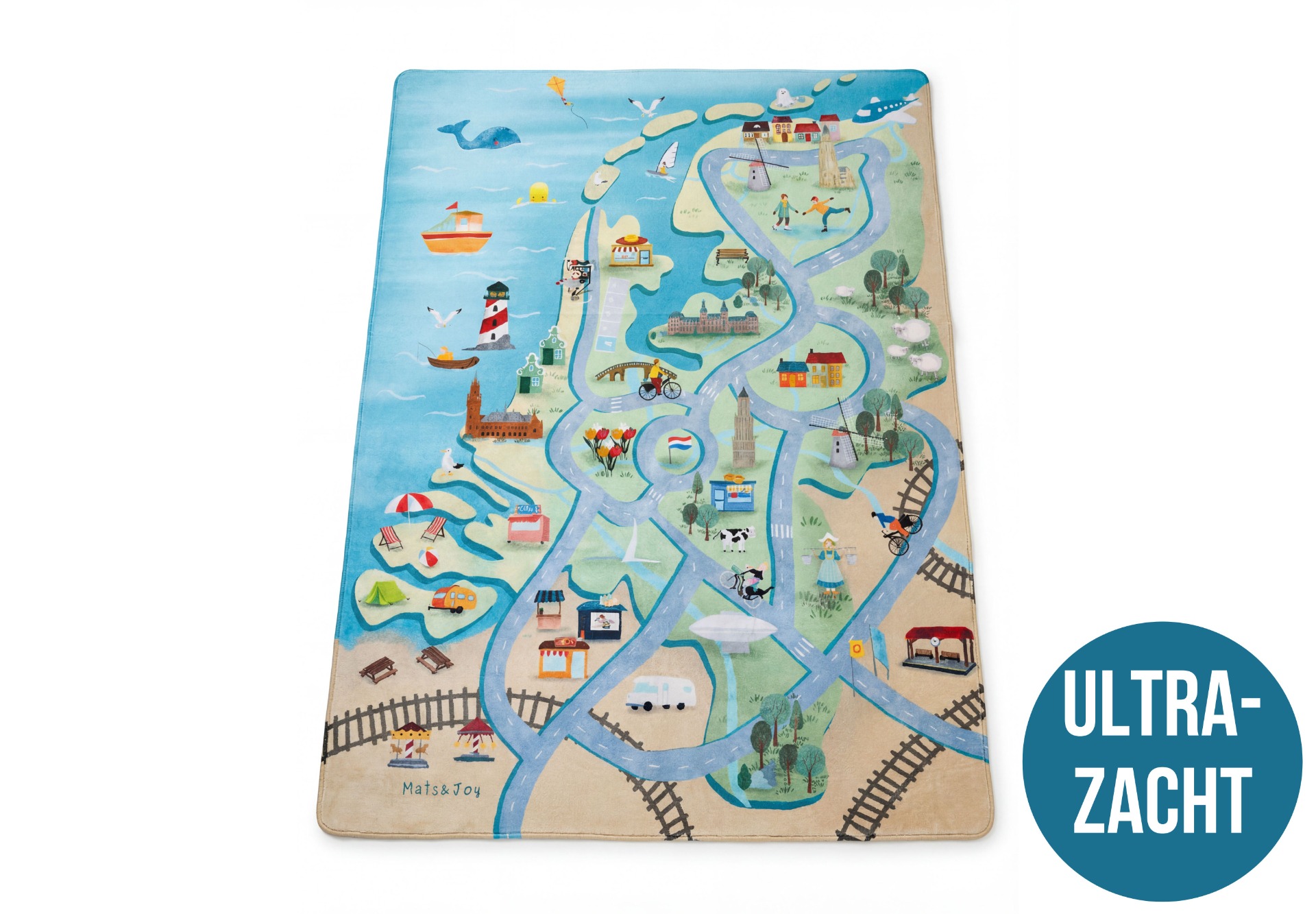 Dit ruime auto tapijt toont een gedetailleerde Nederlandse speelwereld met wegen, rotondes, strand, vuurtoren, molens en herkenbare gebouwen. Ideaal voor kinderen die graag met autootjes spelen en hun eigen mini-wereld creëren.