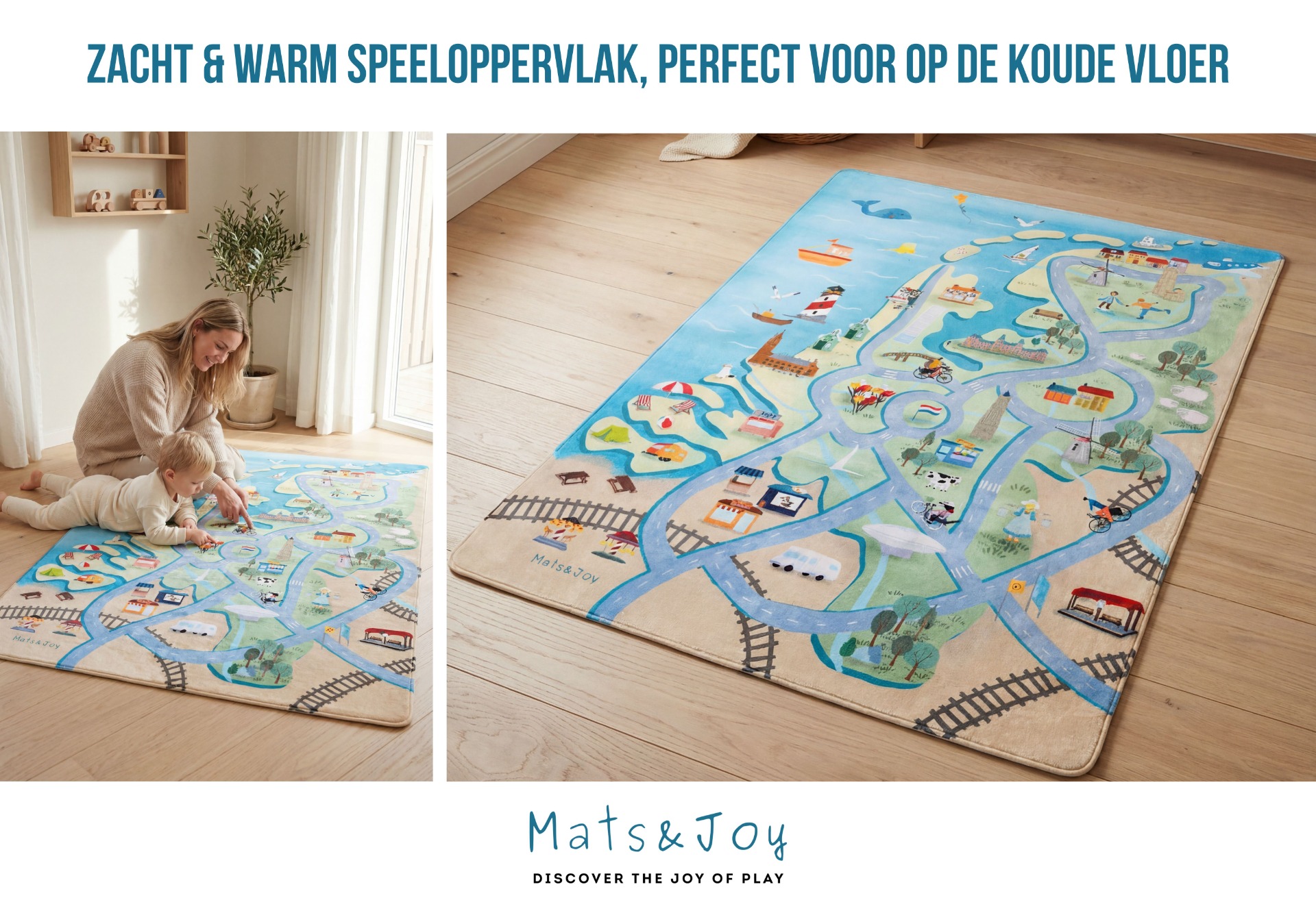 De Mats & Joy® Nederland Auto Speelmat 130x180 cm combineert comfort, veiligheid en fantasierijk spel in één stijlvol speeltapijt.