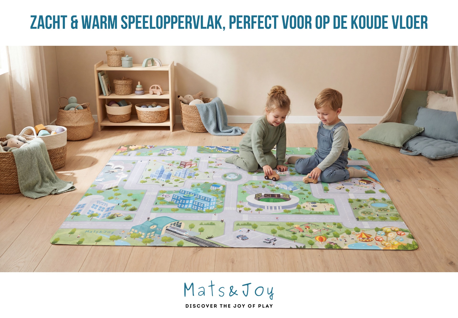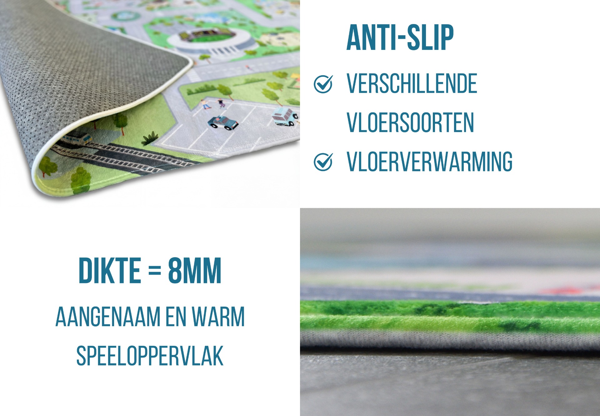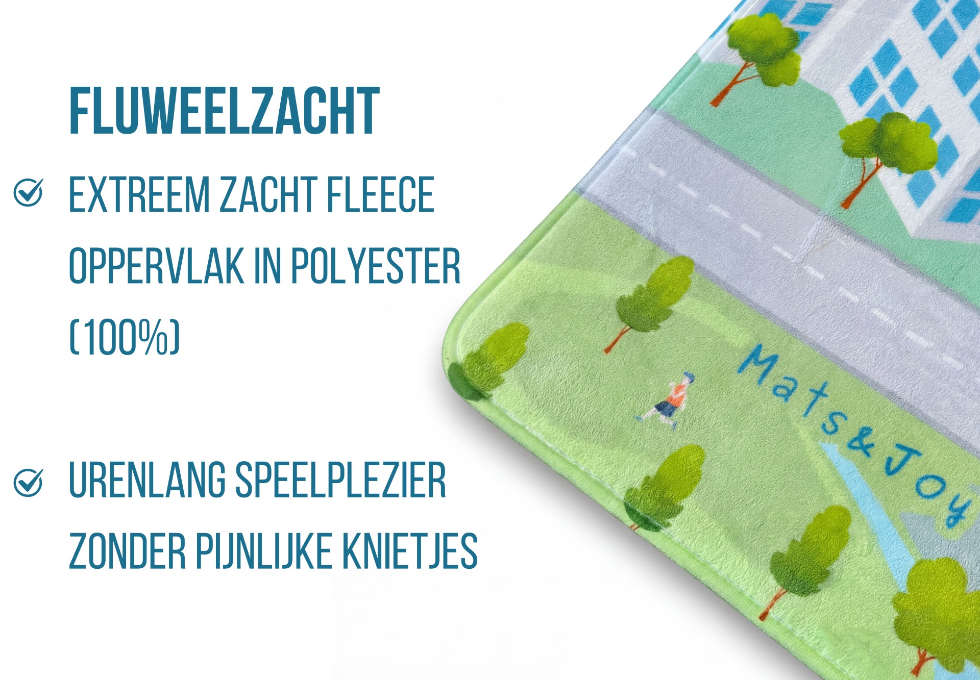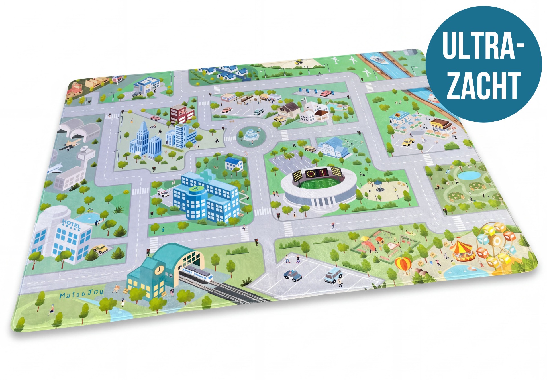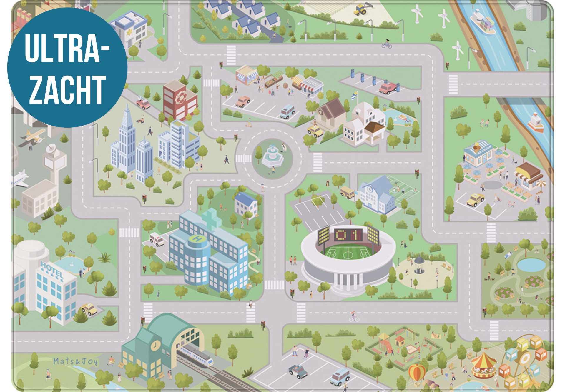 Maak van je vloer een complete speelstad. Deze grote speelmat van 130x180 cm biedt ruimte voor eindeloos speelplezier met autootjes en fantasieverhalen. Fluweelzacht, machinewasbaar en voorzien van anti-slip onderzijde. Ontworpen en digitaal geprint in België.